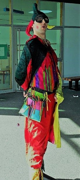Dans son habituel costume fleuri et chamarré, en deux tours de mains Jyjou tord ses morceaux de latex et leur donne vie avant de les offrir aux enfants épatés. C' est un gonfleur de ballons !
